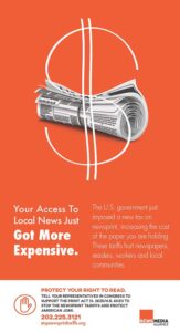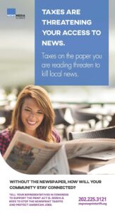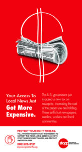 The News Media Alliance and the Stop Tariffs on Printers & Publishers (STOPP) Coalition have provided ads for newspapers to run in their print publications. The ads educate readers on the negative consequences of the recent tariffs imposed on Canadian imports of uncoated groundwood paper, which includes newsprint used by newspapers.